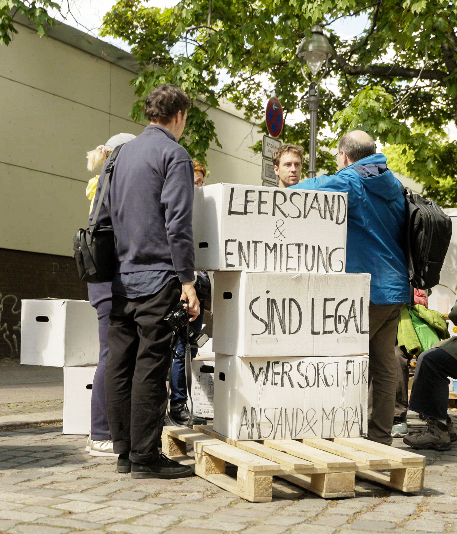 Der Anwalt des Eigentümers (schräg von hinten zu sehen mit blauer Jacke und Rucksack) lehnt während des Interviews mit der TAZ lässig an einem Umzugskartonstapel